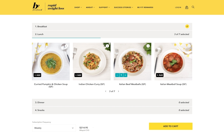 Be Fit Food 02 is another great example of a food delivery and subscription business that recognises meal plans should be highly customisable to match changing taste preferences. They provide an easy add-to-cart experience where users can choose from multiple meals to customise their meal plan.